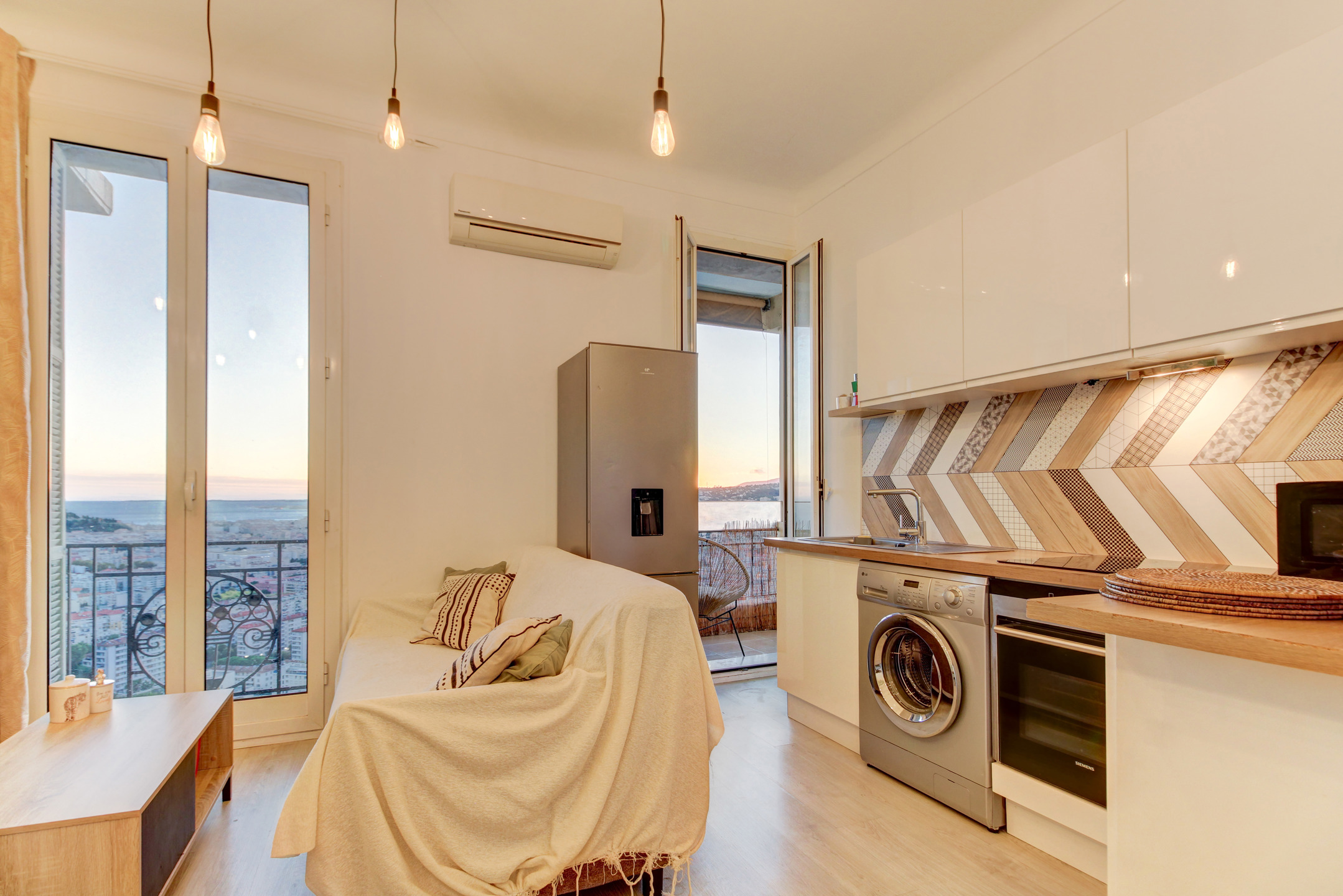 Il se compose d’un séjour lumineux avec cuisine ouverte, d’une chambre principale, ainsi que d’un bureau de 7 m² pouvant aisément servir de petite chambre d’appoint ou d’espace télétravail. Les 3 pièces principales donnent une accés sur le balcon.