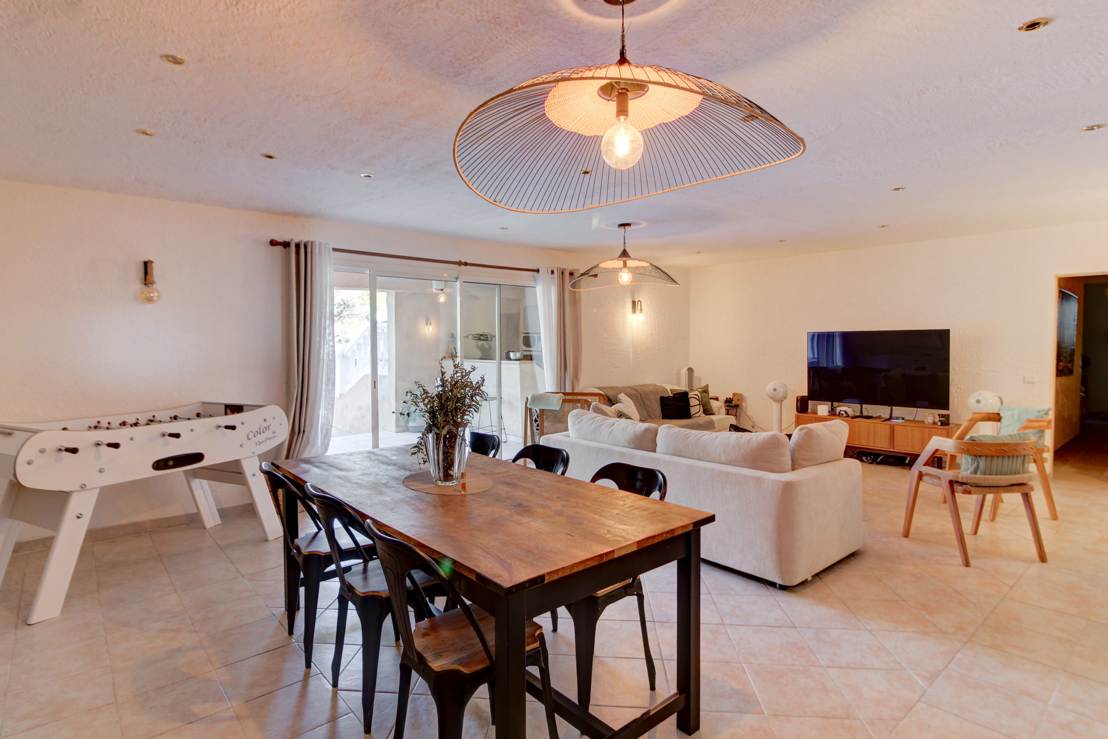 Niveau Principal : Un vaste séjour/salle à manger s'ouvrant sur la terrasse principale, un salon cosy avec coin bar, une cuisine fonctionnelle sur terrasse, une arrière-cuisine, une chambre et une salle d'eau/toilettes.